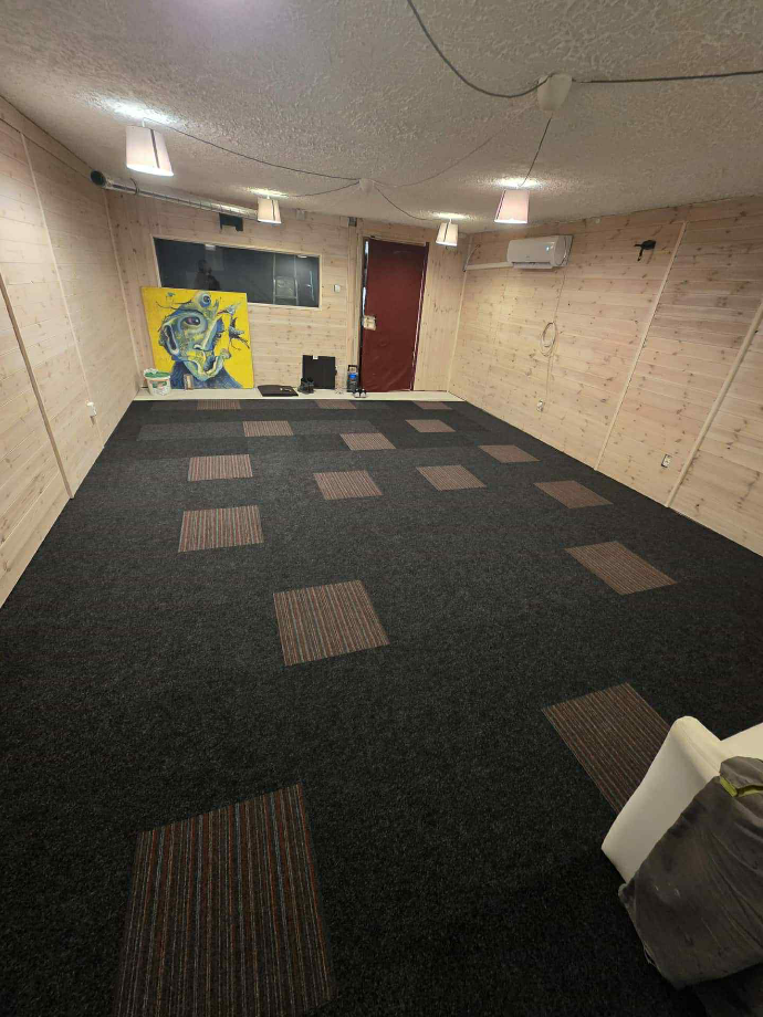 A következő lépés az volt, hogy új szőnyegeket raktunk le. Ez egyszerre komfort és praktikum: jobb érzés a térben dolgozni, és a hangzás szempontjából is sokat számít, ha a helyiség kevésbé „csattog”.